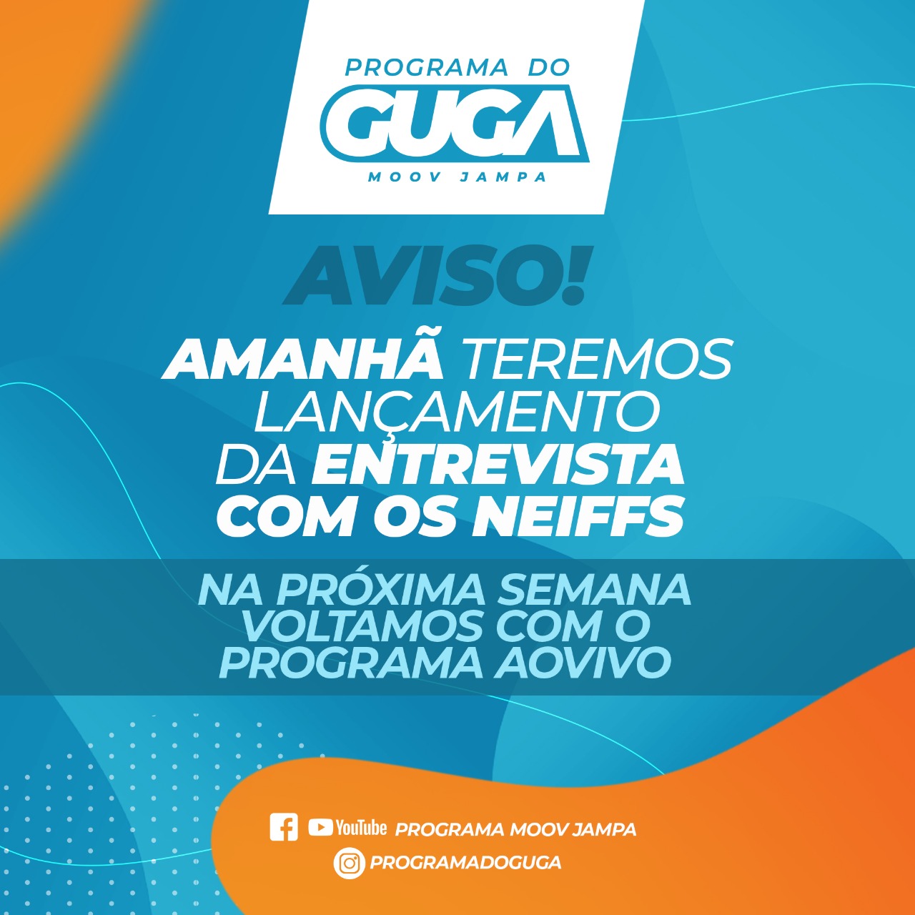 Devido a problemas técnicos, o Programa do Guga ao vivo não acontecerá nesta terça-feira, porém, no mesmo horário, às 19 horas, vai ao ar, uma matéria com eles, que já são figurinhas conhecida e são muito queridos por todos nós, os Neiffs (Anderson e Danilo).